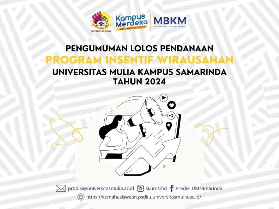 18 Maret 2022Mahasiswa Universitas Mulia berhasil menjadi penerima pendanaan Program Kreatifitas Mahasiswa (PKM) 5 Bidang Tahun 2020 dari Direktorat Pembelajaran dan Kemahasiswaan, Direktorat Jenderal Pendidikan Tinggi (Dikti).