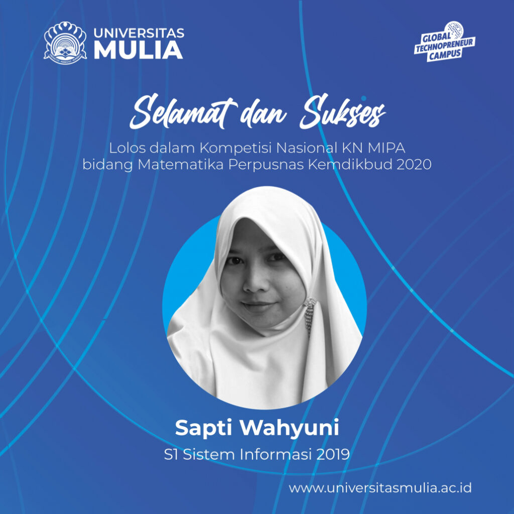 Mahasiswa Universitas Mulia akan kembali berkompetisi di tingkat Nasional. Kali ini, Sapti Wahyuni mahasiswi program studi Sistem Informasi Kampus Samarinda yang lolos dalam seleksi Kompetisi Nasional Matematika dan Ilmu Pengetahuan Alam (KN-MIPA) 2020